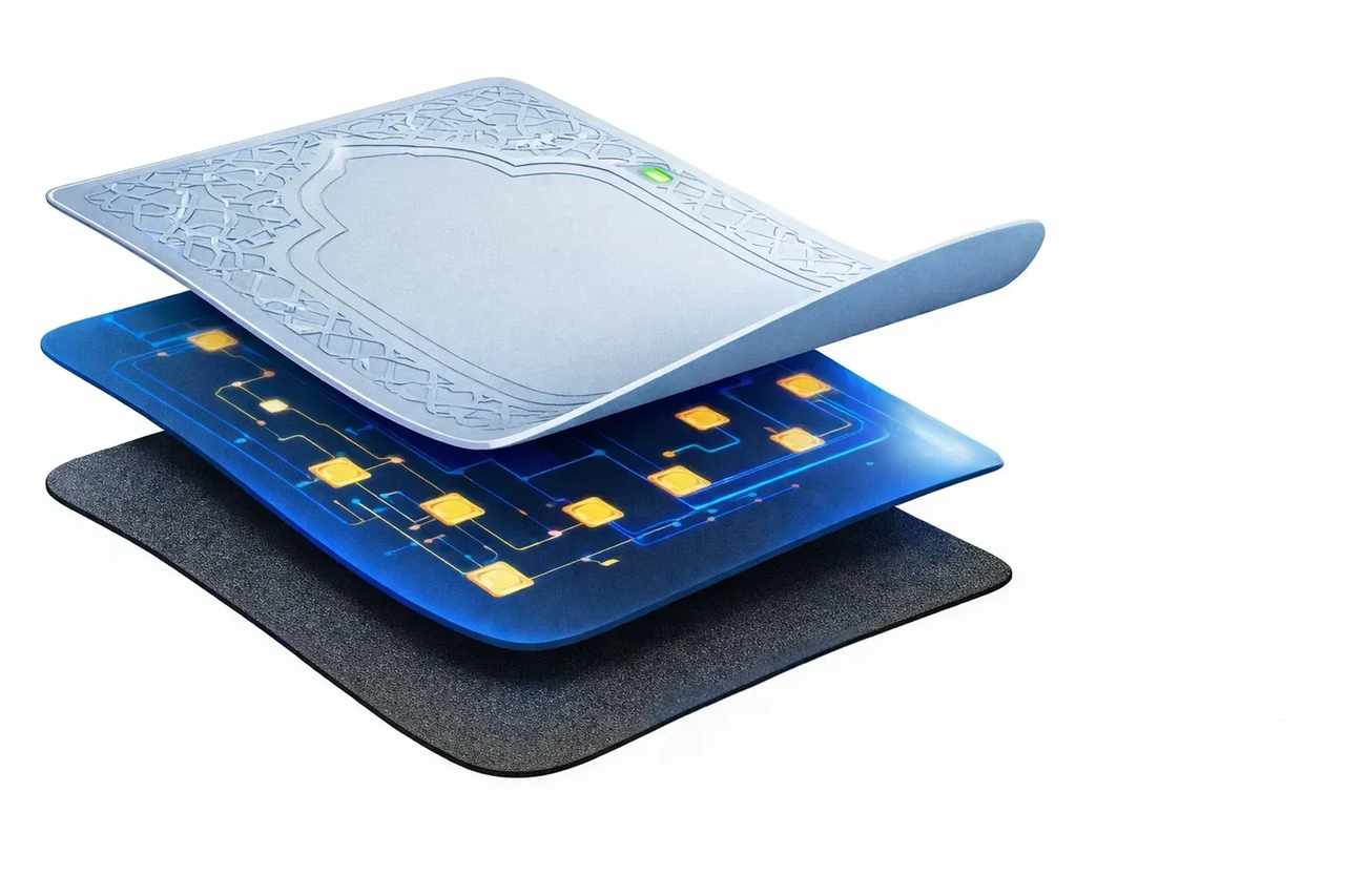 Three-layer structure: Silicone, Sensor, Natural rubber. A soft, quiet, Muslim-friendly surface offers durability, shock absorption, and a non-slip base for focused prayer.